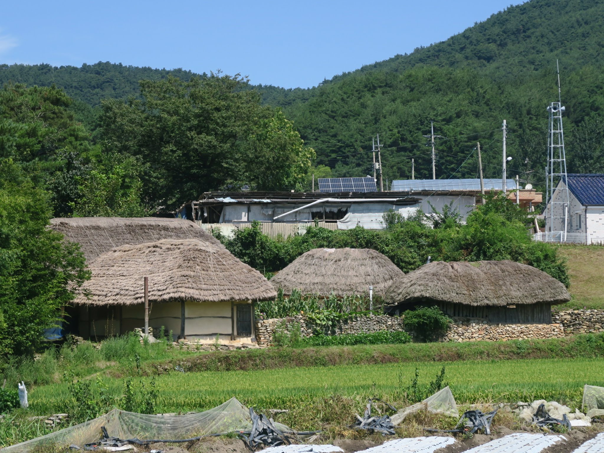 구룡치에서 내려 와 잠시 지방도를 걷다 보면 멀리 회덕마을의 초가집들이 보인다. 관광용으로 지어놓은 거겠지 생각했는데, 빨래들이 널려 바람에 흔들리는 게 보인다. 실제 사람이 사는 집이라는 뜻이다. 집이란 사람이 살아야 오래 가는 법이다. 다듬고 보수하고 고치고 새로 올리면서 집은 단단해진다. 수십년만에 보는 초가집이 반가웠다.