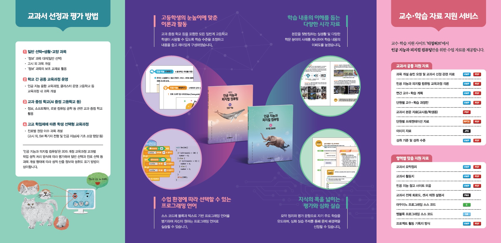 저희가 개발한 인공지능 교과서가 드디어 세상에 나왔습니다. 인공지능 관련 교재들은 이미 많이 나와있지만 학교 수업을 위한 교육과정과 그에 따른 수업 시수 배분, 다양한 교수학습 자료까지 품고 있는 교육도서는 교과서뿐이죠. 이미 교육부는 인공지능과 관련한 신설 교과를 공식적으로 발표할 예정인데 그에 앞서 먼저 교과서로서 자격을 갖춘 책을 낼 수 있어 기쁩니다. 교육 현장에서 잘 활용될 수 있기를 바랍니다.