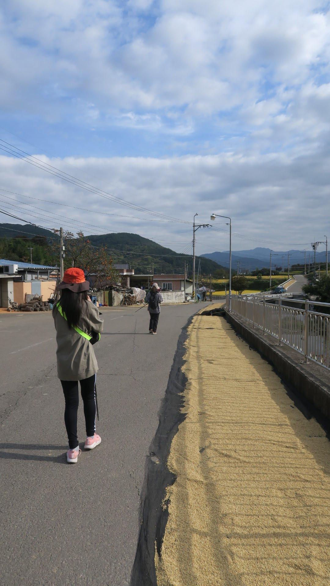 수철리 마을 회관 앞 공터에서는 이삭을 말리고 있다. 고속도로를 나와 지방도로를 달릴 때에도 한적한 곳에는 여지없이 벼를 말리는 풍경을 볼 수 있다. 벼를 잘 말려야 썩지 않고 오래 보관할 수 있다. 요새는 다들 건조기에서 말리지만 일부러 건조기를 쓰지 않는 경우도 많다. 이렇게 들판에 벼를 말리는 일은 여간한 일이 아니라고 한다. 매번 요리조리 잘 뒤집어 골고루 말리는 일도 번거롭지만 안 본 틈에 짐승들이 접근해 먹어치우는 것도 감시해야 할 것이다. 자칫 지나가는 차량들이 실수로 밟고 지나가는 일도 벌어진다. 정말 재수 없으면 일기예보에도 없던 비가 내리는 일이다. 대부분이 노인들인 시골에서는 벼를 말리는 일도 거두는 일도 뒤적거리는 일도 모두 수작업이라 보통 힘이 드는 일이 아니다. 그럼에도 불구하고 편리한 건조기를 마다하고 굳이 여기 아스팔트 바닥 위에 말리는 건, 가을 햇살이 주는 오묘한 맛이 있기 때문이다. 고추도 건조기에 말리는 것보다 햇볕 아래 말리는 것을 더 높게 쳐주듯이 밥맛도 건조기로 말린 쌀보다 이렇게 햇볕에 말린 쌀이 더 좋다고 한다. 널어놓은 벼가 바싹 말라가는 시간은 밥이 맛있어지는 시간이다.