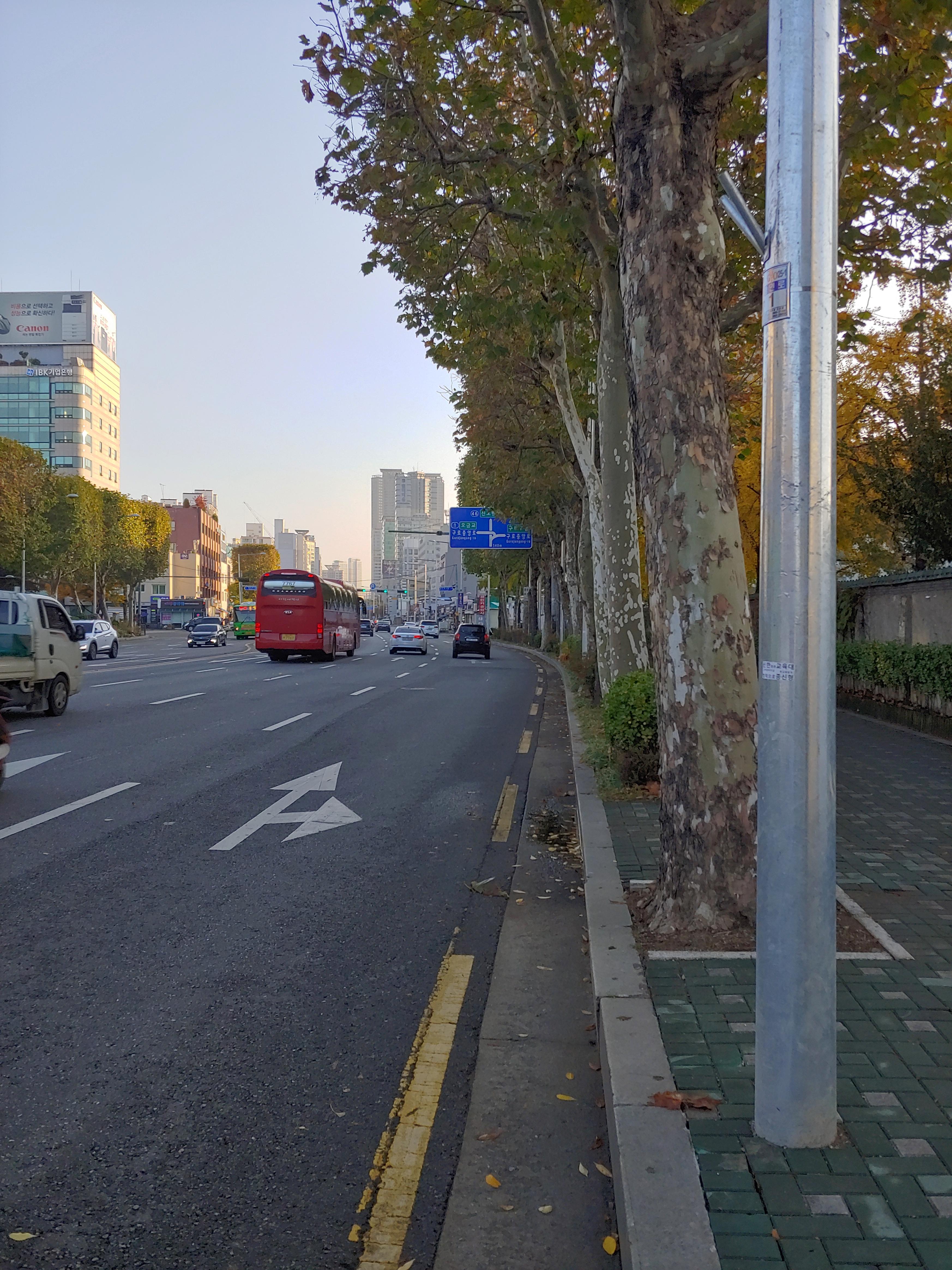 롯데마트를 지나면서 차량 통행이 줄어듭니다. 많은 차가 서부간선도로나 안양천길로 들어가기 때문입니다. 하지만 영등포 제일제당 공장 정문 앞까지는 인도로 달리는 게 안전합니다. 차도가 좁고 인도에 사람 통행이 적기 때문입니다.