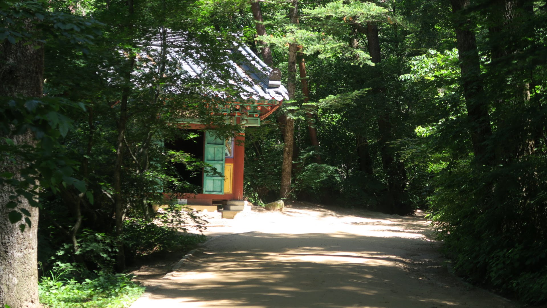 파란 하늘이 산사를 둘러싼 초록을 더 짙게 물들인다.