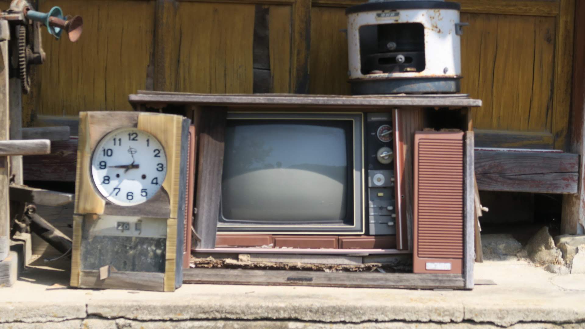 낡은 집 반석 위에는 오래된 텔레비전과 시계가 나와 있다.