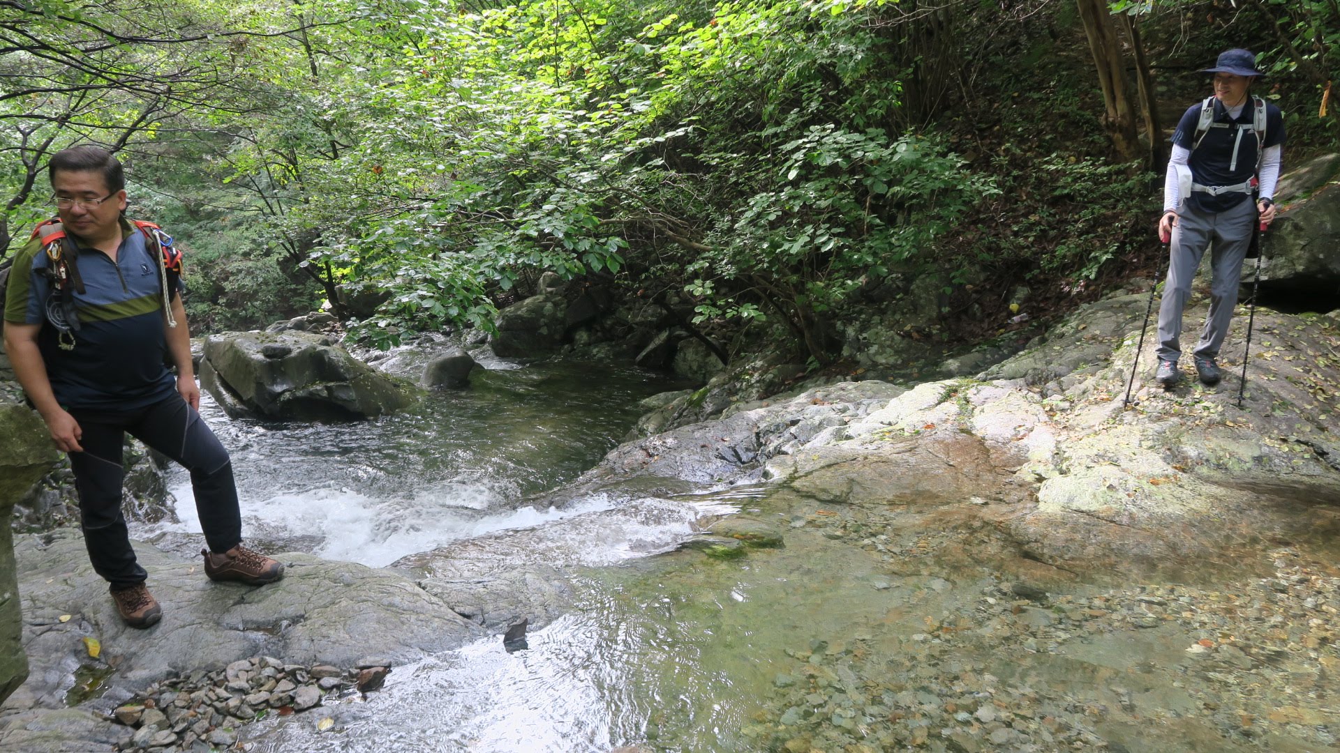 119농원을 지나서 조금만 걸어가면 작은 계곡을 하나 건넌다. 다리가 따로 없다. 물이 적을 때는 그냥 건널 수 있겠는데, 전날 비가 와서 그런지 훌쩍 뛰어 건너기는 약간 불안했다. 신발과 양말을 벗고 발을 물에 담그며 건넜다. 매미의 울음소리가 들리는 숲속이었지만 깊은 산에서 내려온 물은 얼음장처럼 차갑다.