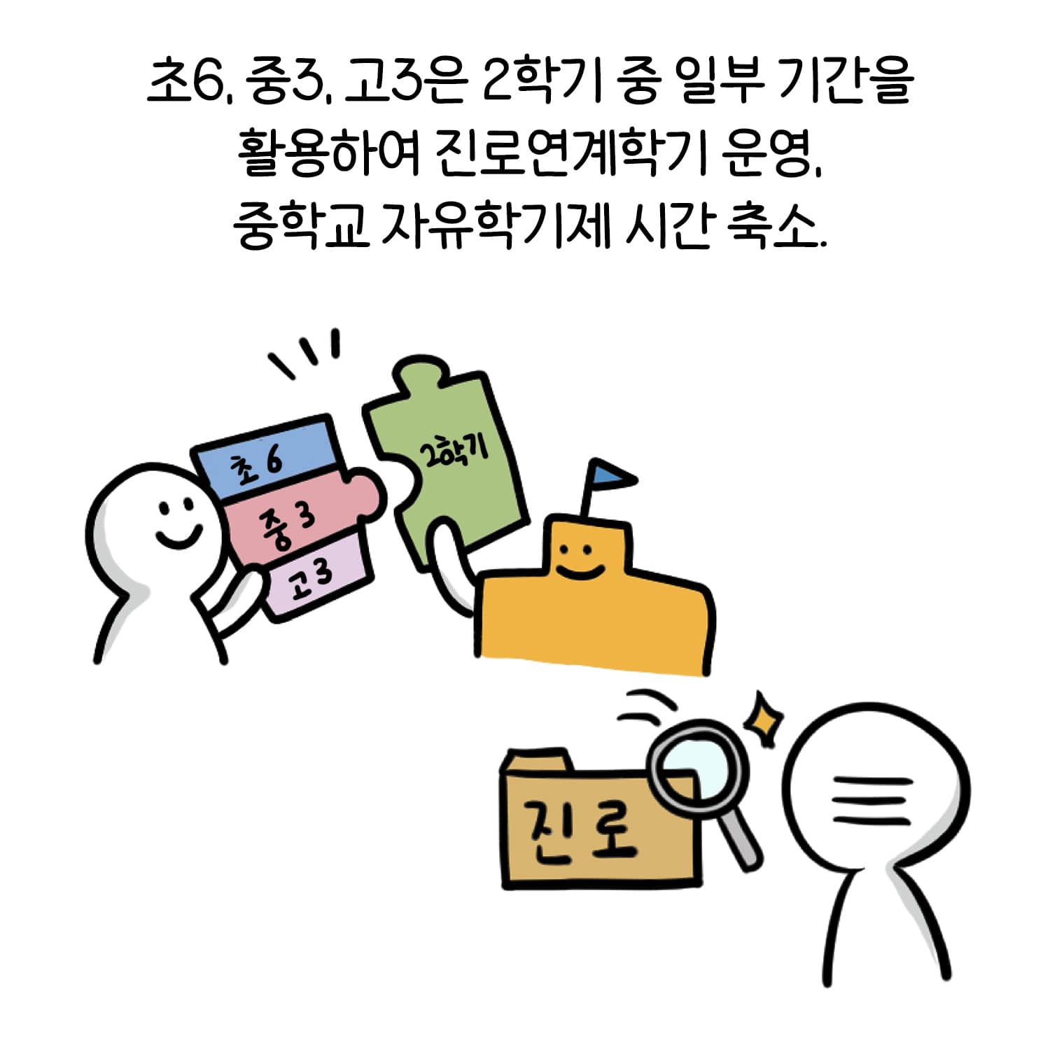 중학교 자유학기제가 크게 바뀌는 듯하다. 기존 1학년 전학기가 자유학기제로 적용되었는데, 이번 교육과정에서는 1학년 1학기(1/2학기 중 선택)만 적용된다. 대신 3학년 2학기가 '진로 연계 학기'로 운영된다. 학교는 교과별로 진로 단원을 신설할 수 있고, 창의적 체험활동의 진로 활동을 연계할 수 있게 하였다. 또 학교 자율 시간을 활용하여 진로 관련 선택 과목을 운영하는 것도 가능하다.