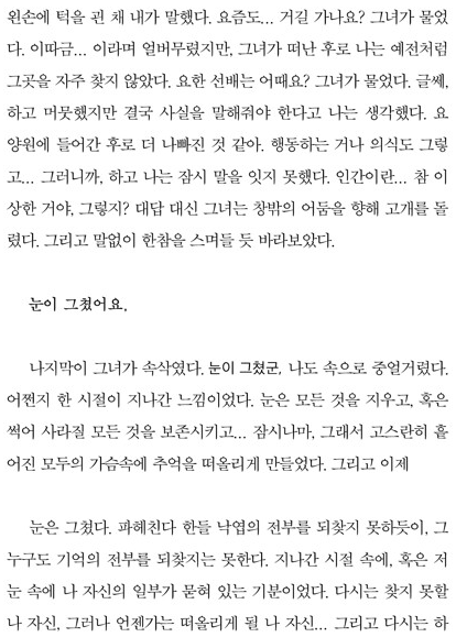시간이 지나면서 잊혀질 거라 생각했어. 다시 지하주차장에서 일할 때는 '희재'라는 명품샵에서 일하는 예쁜 여자애도 만났지. 그저 껍데기만 좋아했지, 알맹이는 아무것도 아니더라. 그런데 희재를 통해 '그녀'의 주소를 알게 됐어. 집앞까지 찾아갔지만 그냥 돌아섰어. 스스로 나를 떠난 사람이잖아. 이렇게 불쑥 얼굴을 내미는 건 아니잖아. 아직 '그녀'는 나를 만날 준비를 하지 않았을 거야. 조용한 '그녀'의 삶에 다시 파문을 만들 수는 없잖아. 그래서 '나'도 장문의 편지를 남겼어. 12월 25일 다시 이곳에 올테니 만나고 싶다면 나와 달라고 남겼지.