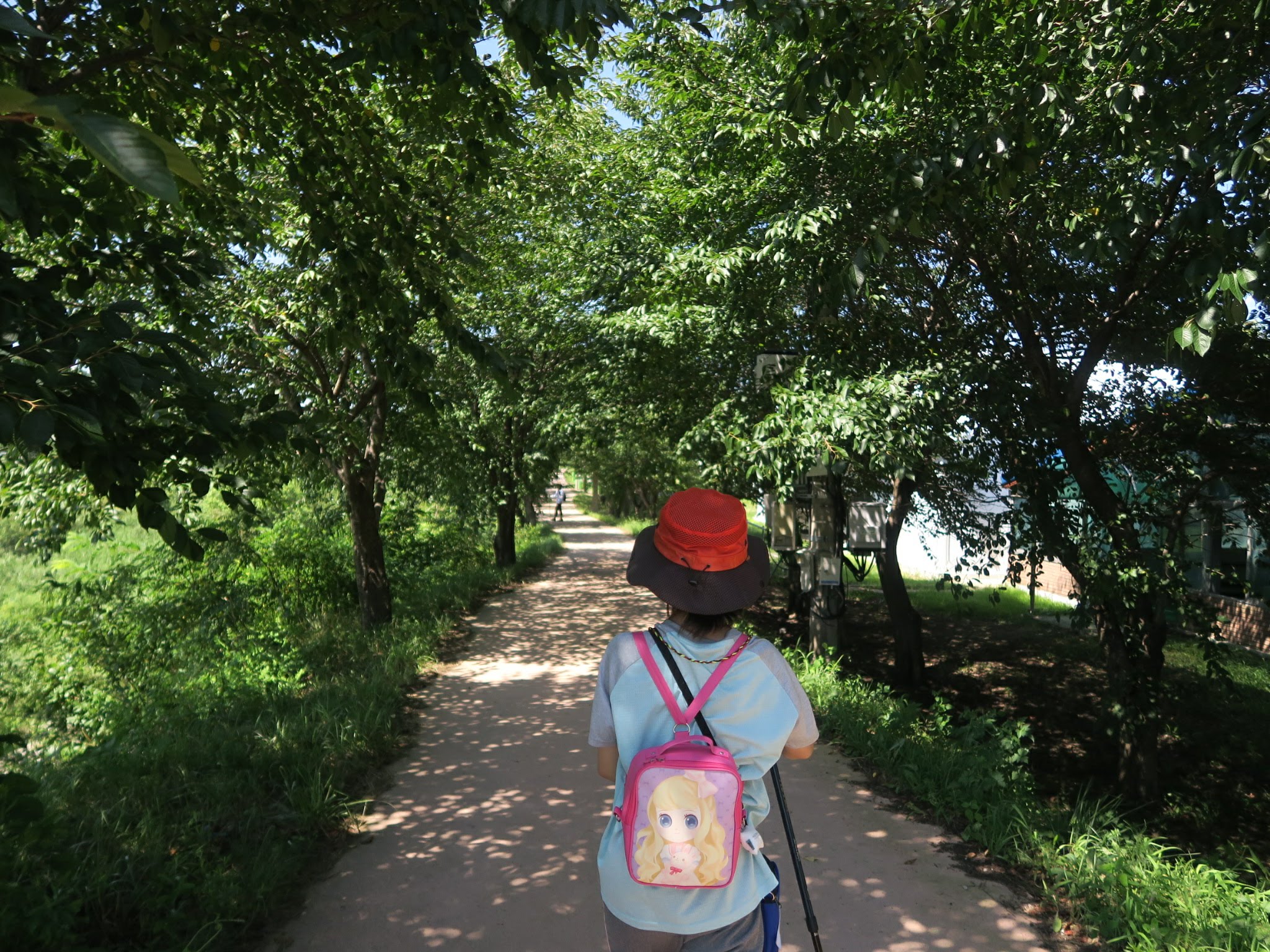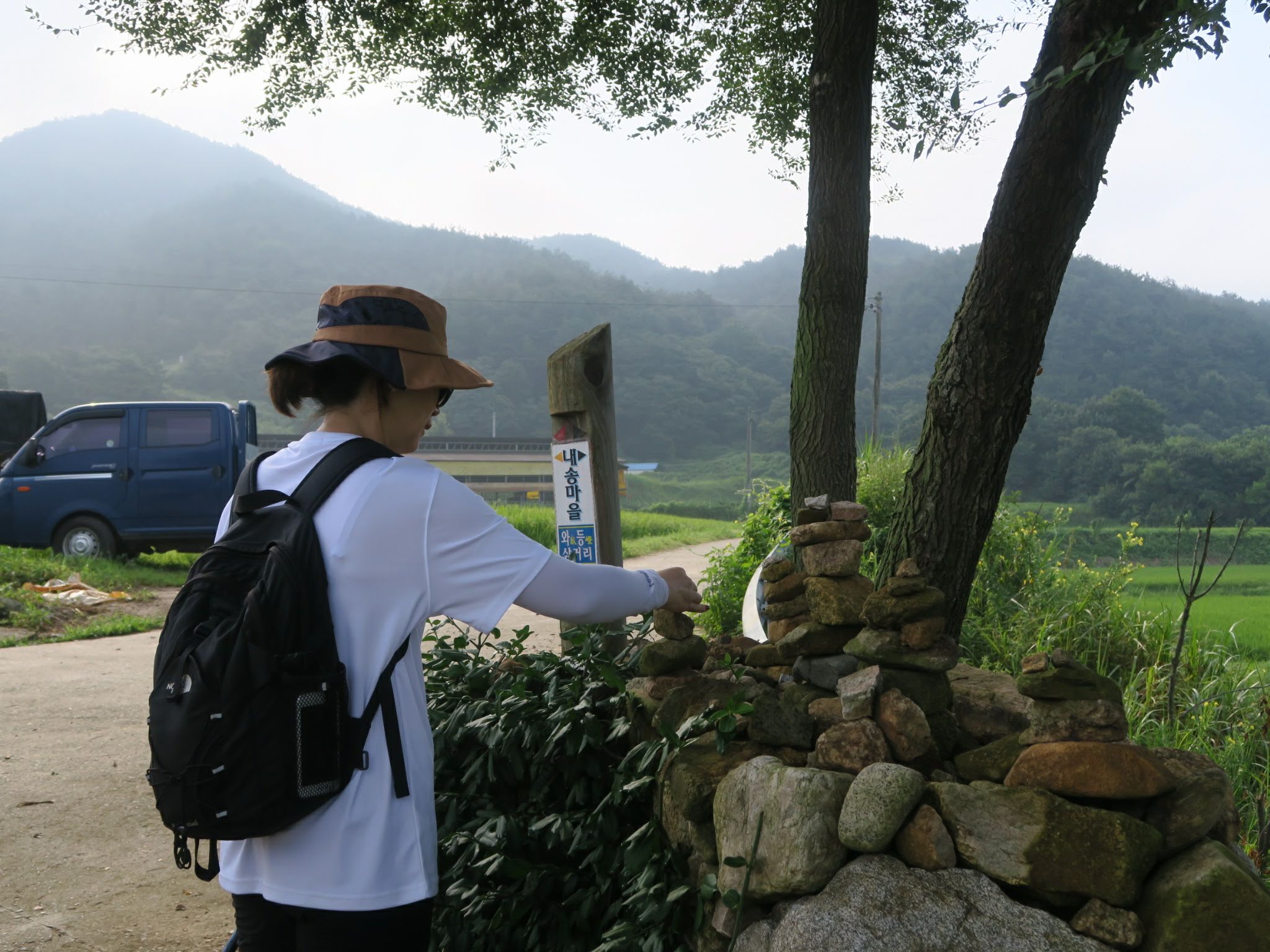 가장마을을 벗어나면서부터는 평지길이다. 그늘이 별로 없어 뜨거운 햇살을 그대로 받을 수도 있다. 다행스럽게도 이날은 바람이 좋았다. 해발 500m의 운봉고원을 가르는 바람은 너무나 시원해 뜨거운 햇살을 금새 식혀 주었다. 가지고 있는 스틱을 이용해 잠자리 낚시를 해 보면서 아이는 즐거워했다. 구룡치를 넘으며 숨이 넘어갈 것처럼 힘들어 하더니 금새 회복한 것이다. 아이의 회복력은 정말 놀랍다. 서로의 스틱과 모자와 어깨에 앉은 잠자리를 보면서 즐거워 하며 시골길을 걸었다.