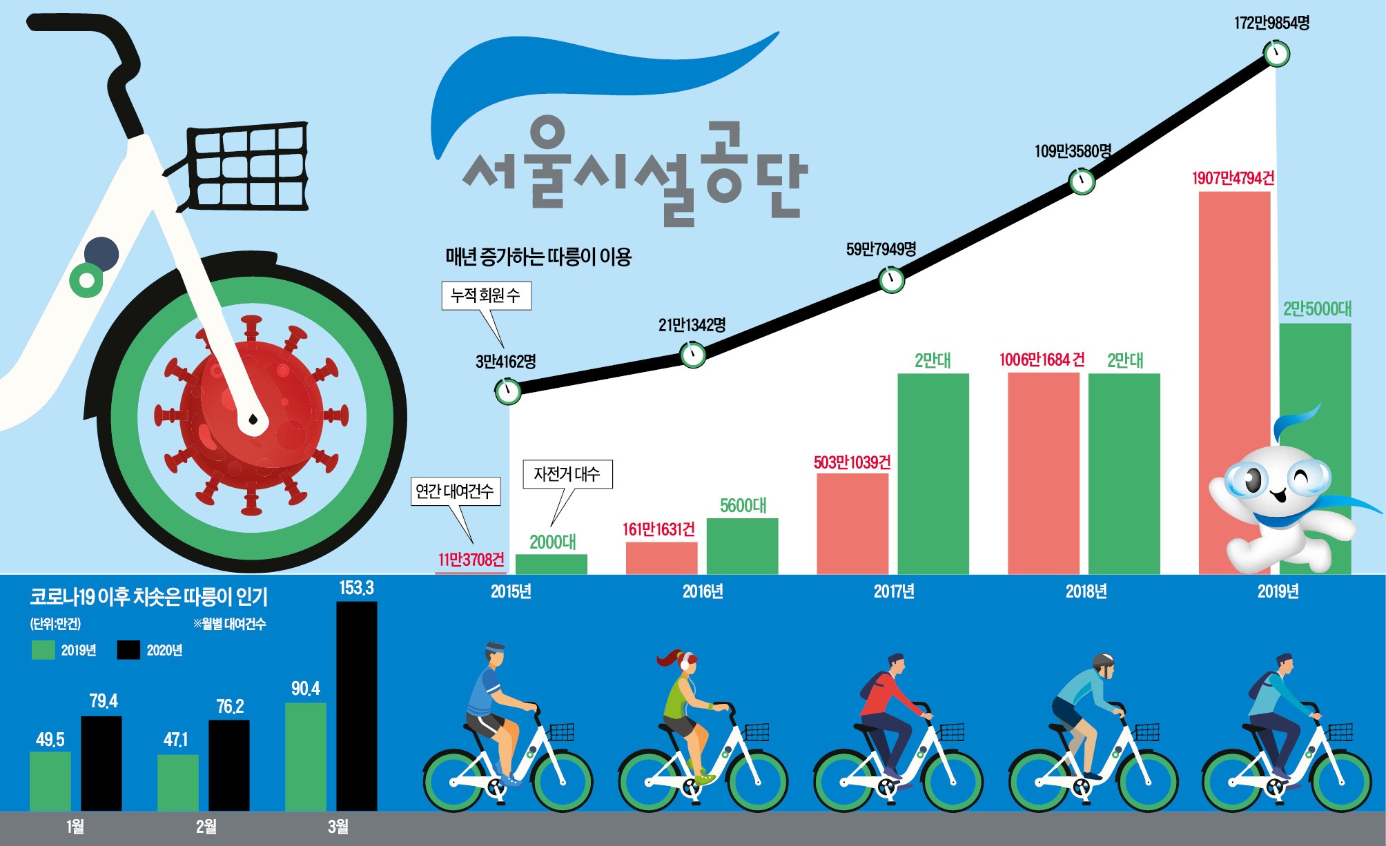 따릉이 회원 수가 작년 기준 200만명이 넘는다고 한다. 서울시 인구가 1천만명 정도라고 할때 10명 중 2명이 따릉이 회원인 셈이다.