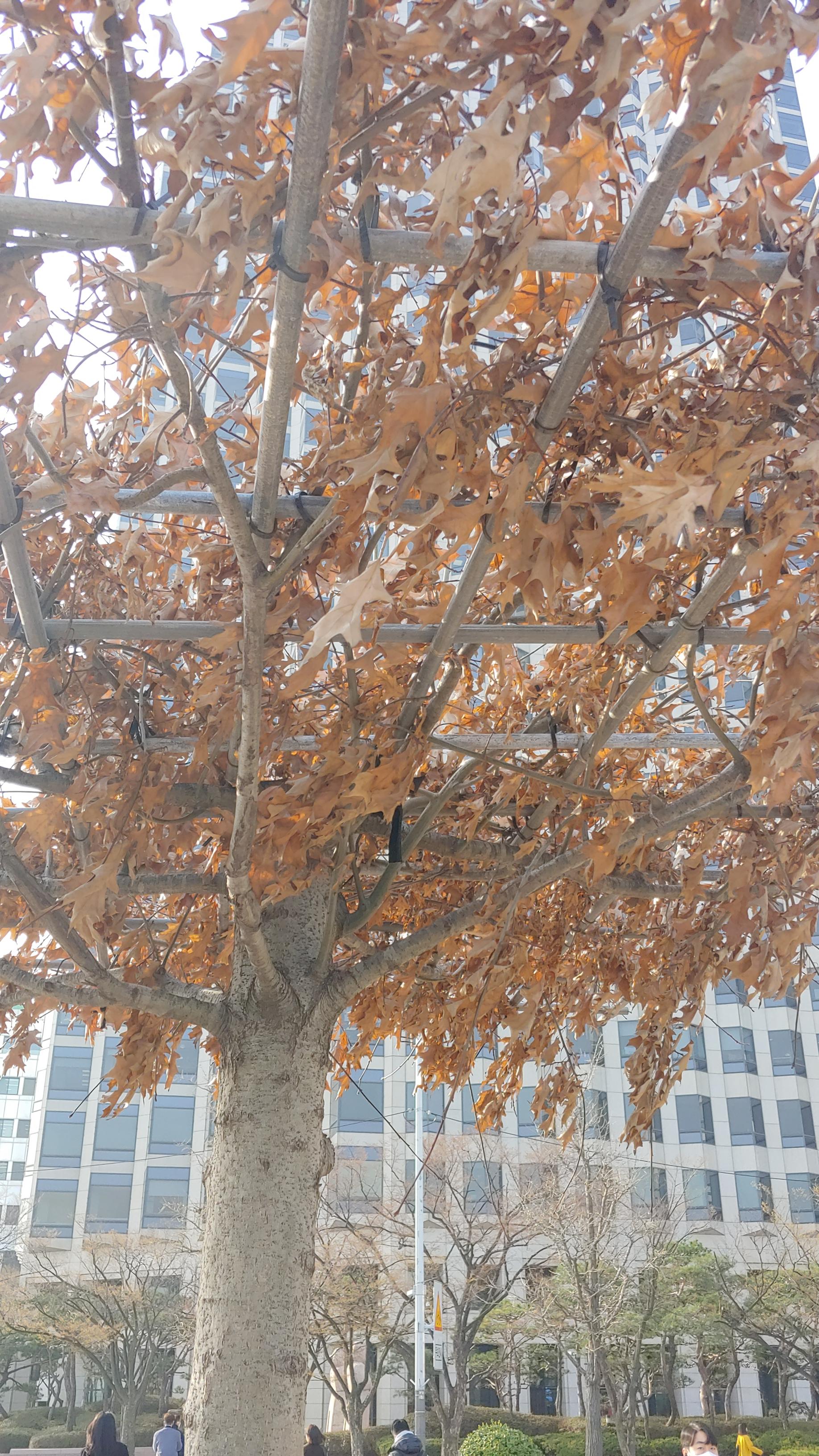 대부분의 나무들이 겨울을 나기 위해 잎을 떨어뜨리는데 여의도의 그 대왕참나무 그늘목은 왜 잎을 그대로 달고 있는 것일까? 여러 가설들을 찾아볼 수 있었다.
